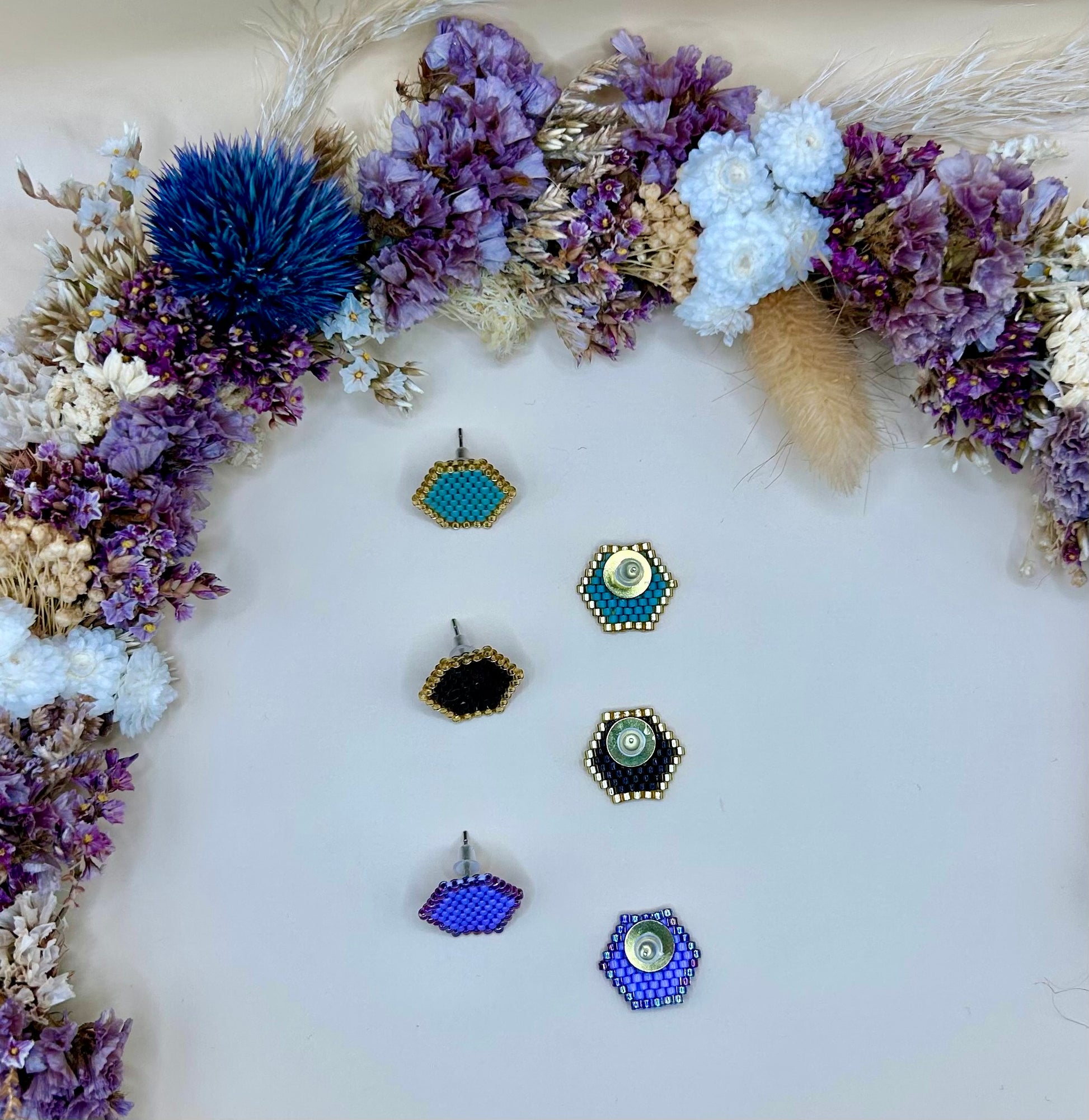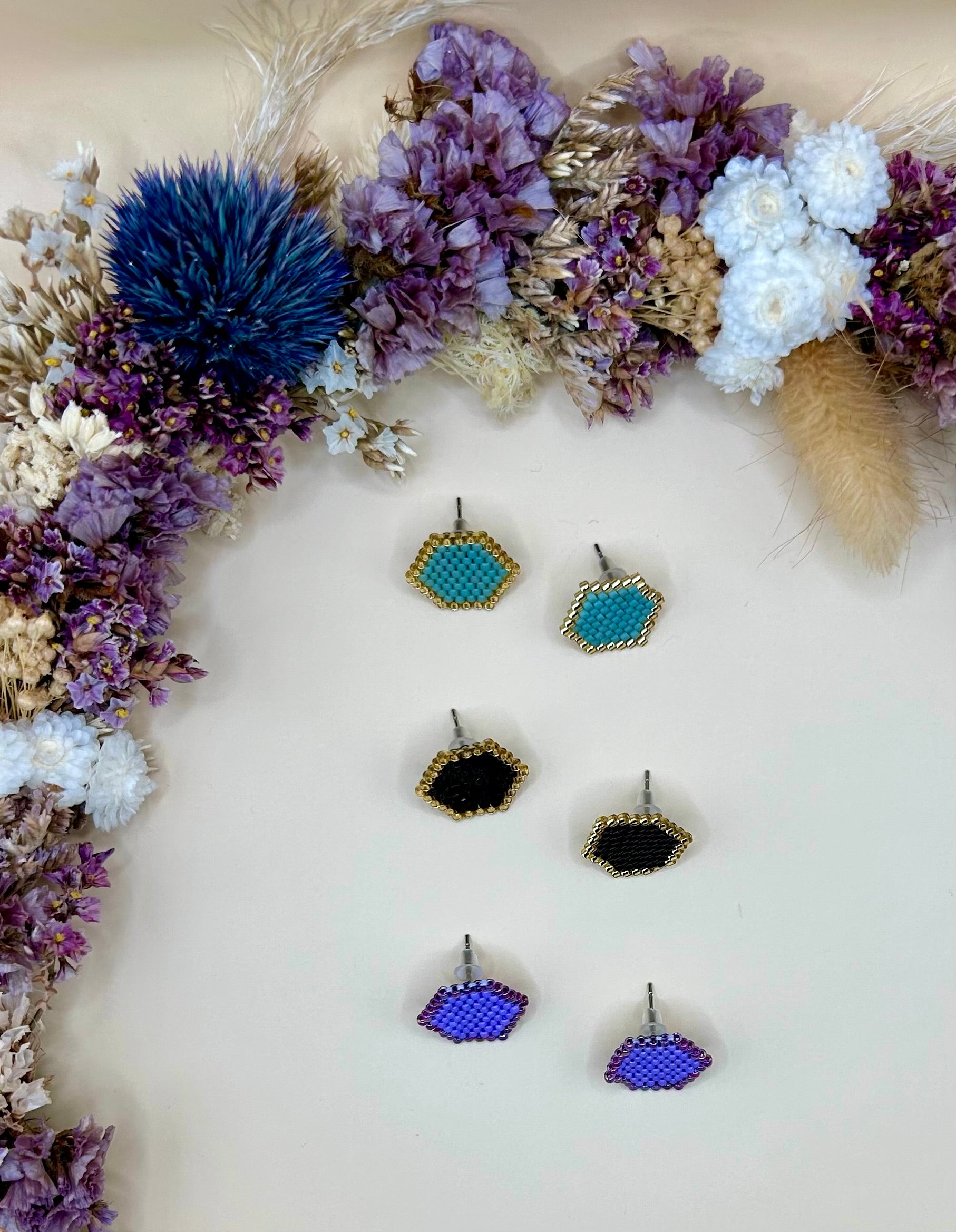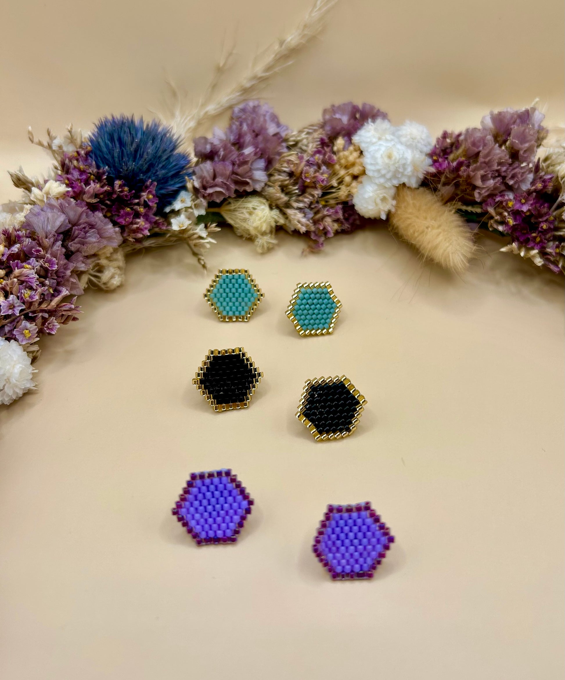 Ajoutez une touche élégante et moderne à votre style avec ces boucles d’oreilles hexagonales. Confectionnées à la main avec des perles Miyuki de qualité, elles offrent un design géométrique unique et raffiné.