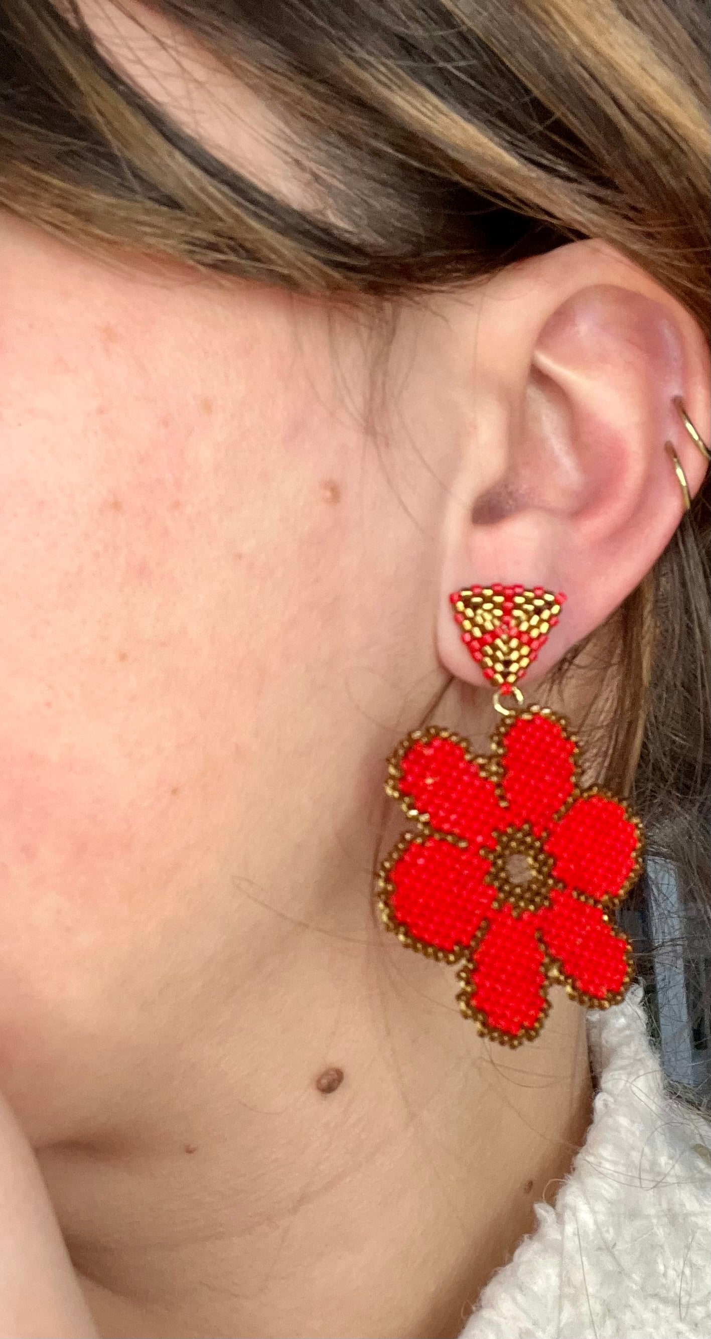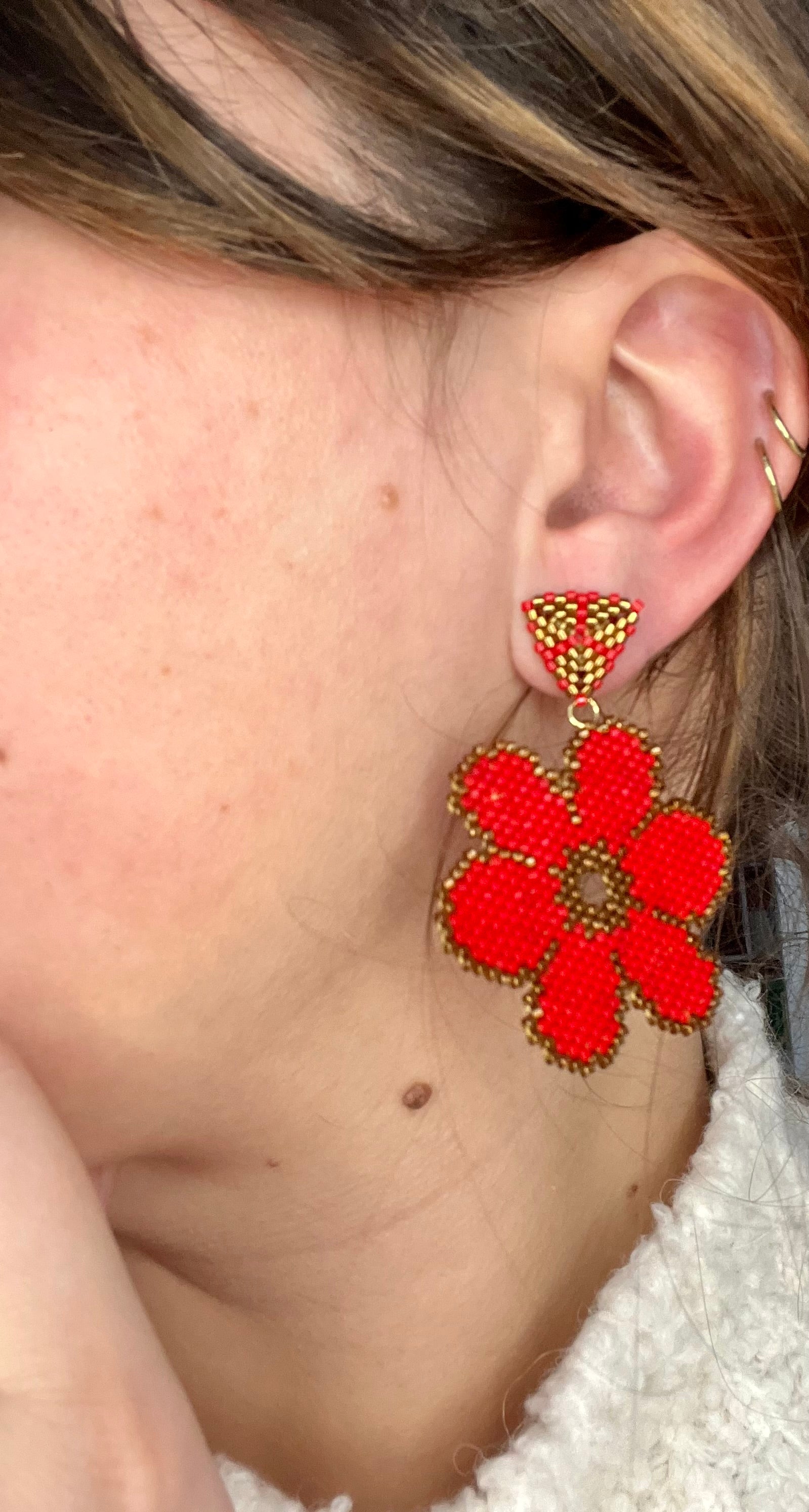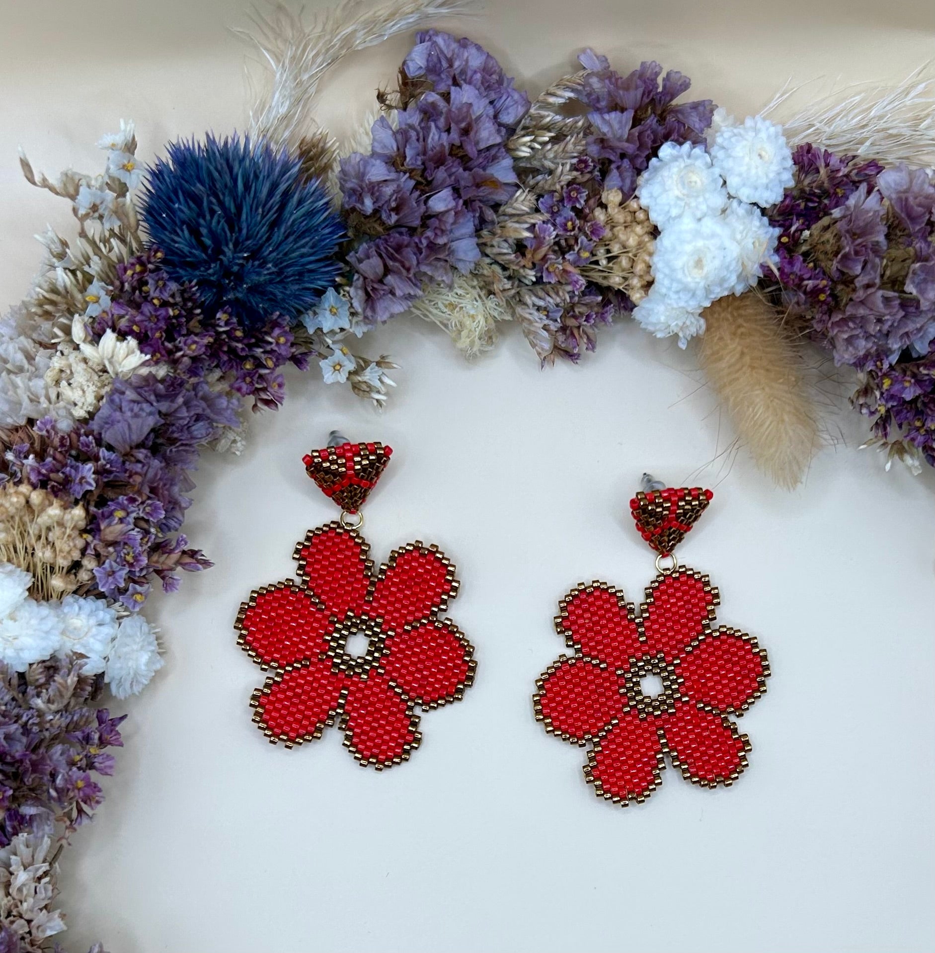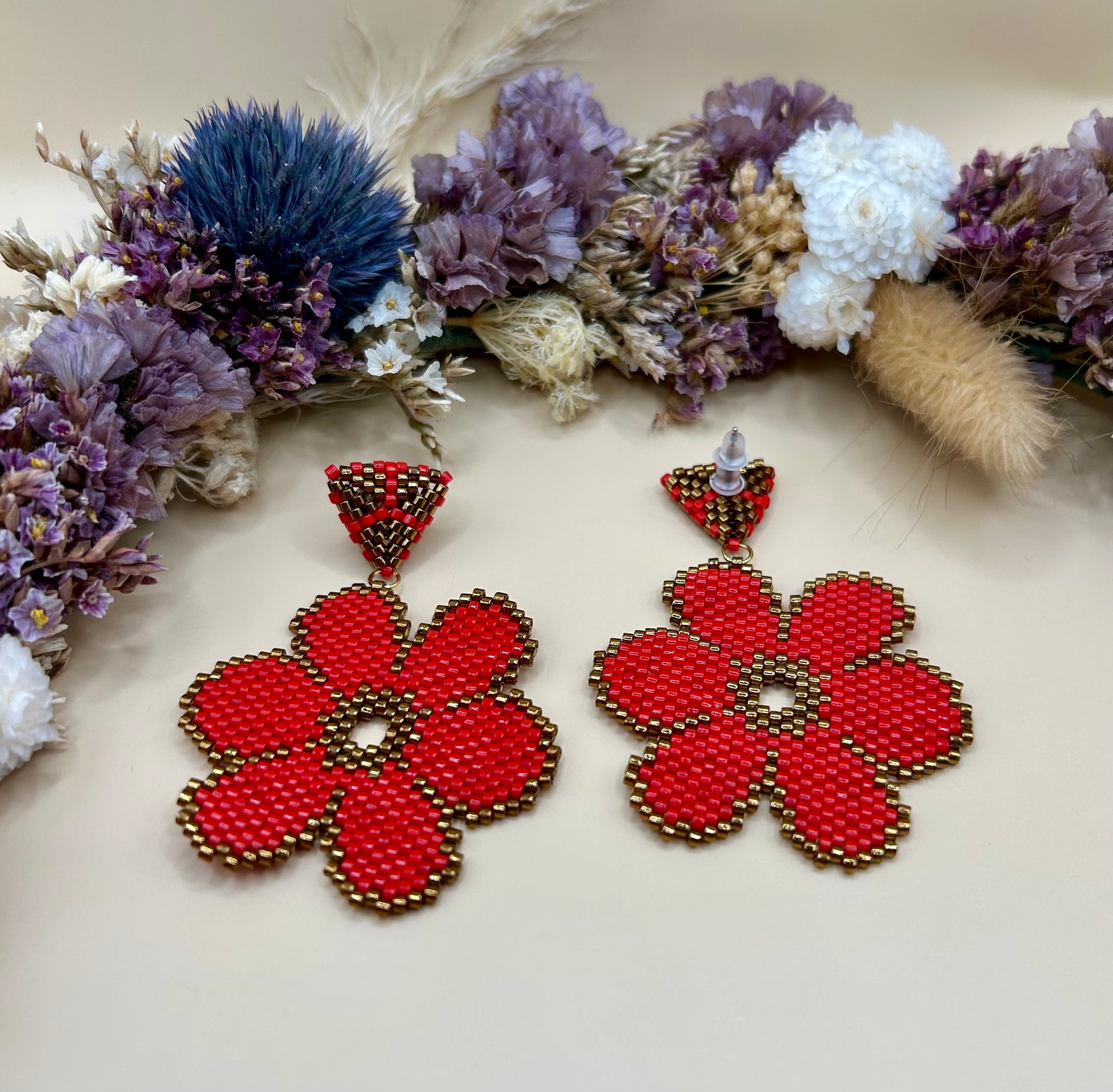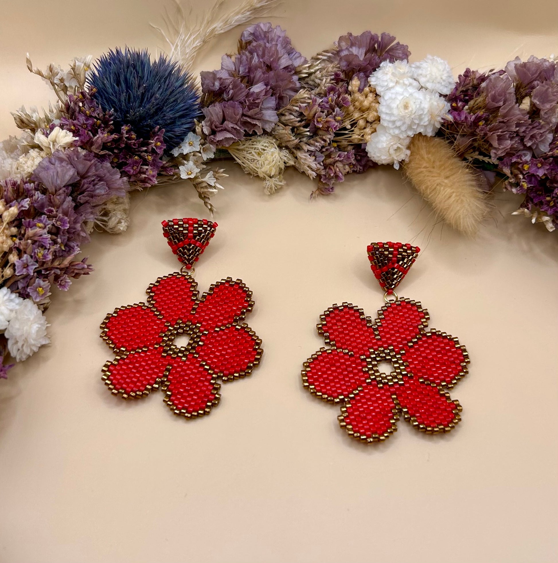 Ces pièces uniques, aux pétales rouges bordés de doré, ajoutent une touche lumineuse et féminine à toutes vos tenues. Parfaites pour celles qui souhaitent afficher un style affirmé et raffiné.