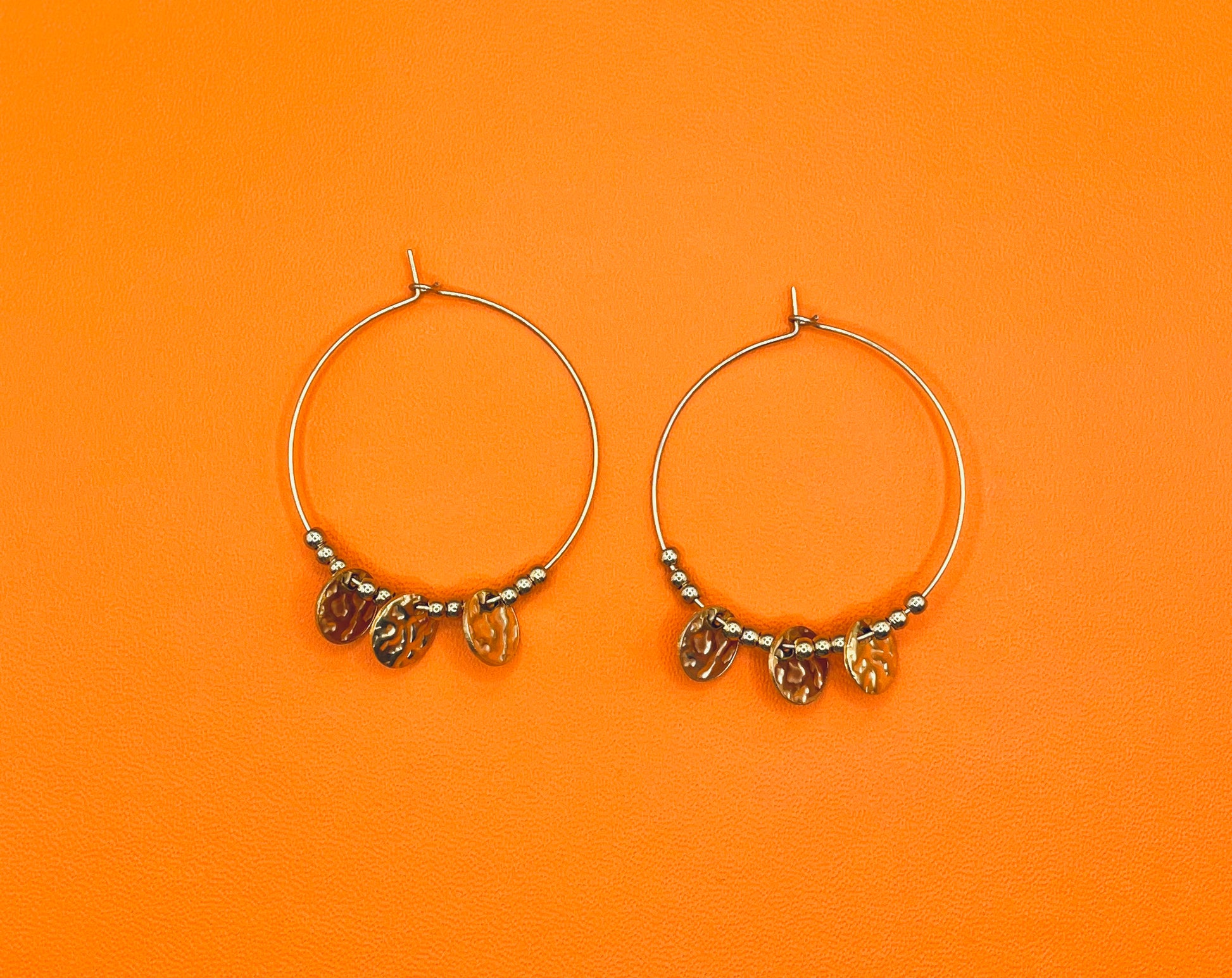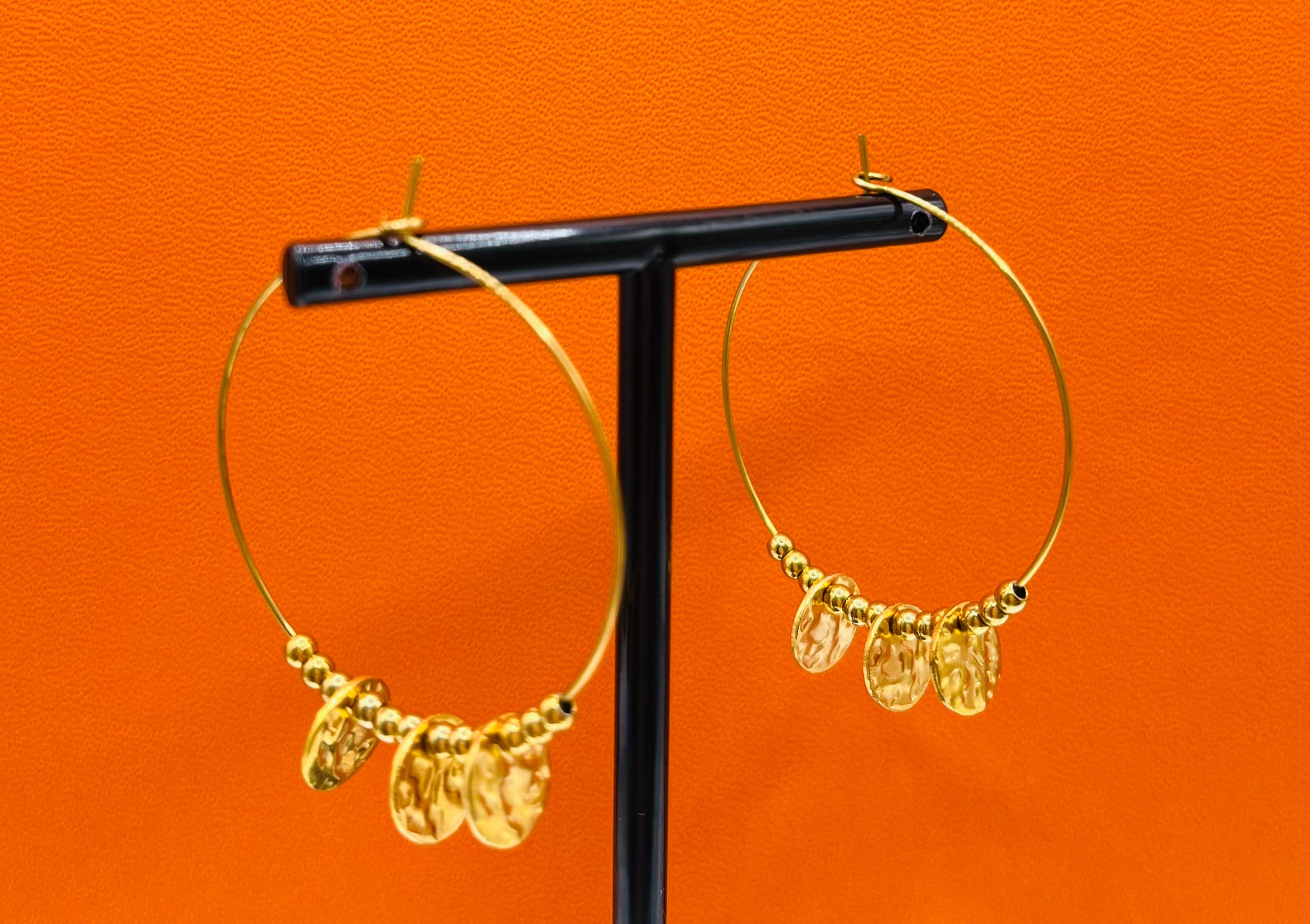 Craquez pour nos créoles en acier inoxydable doré, ornées de délicates pampilles martelées et de petites perles dorées.