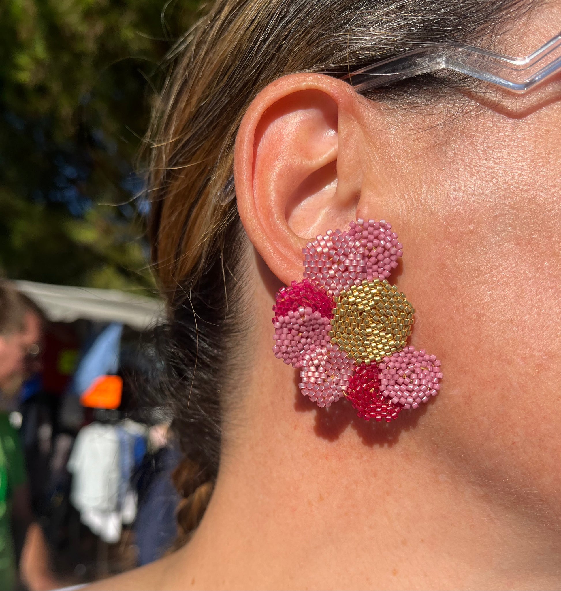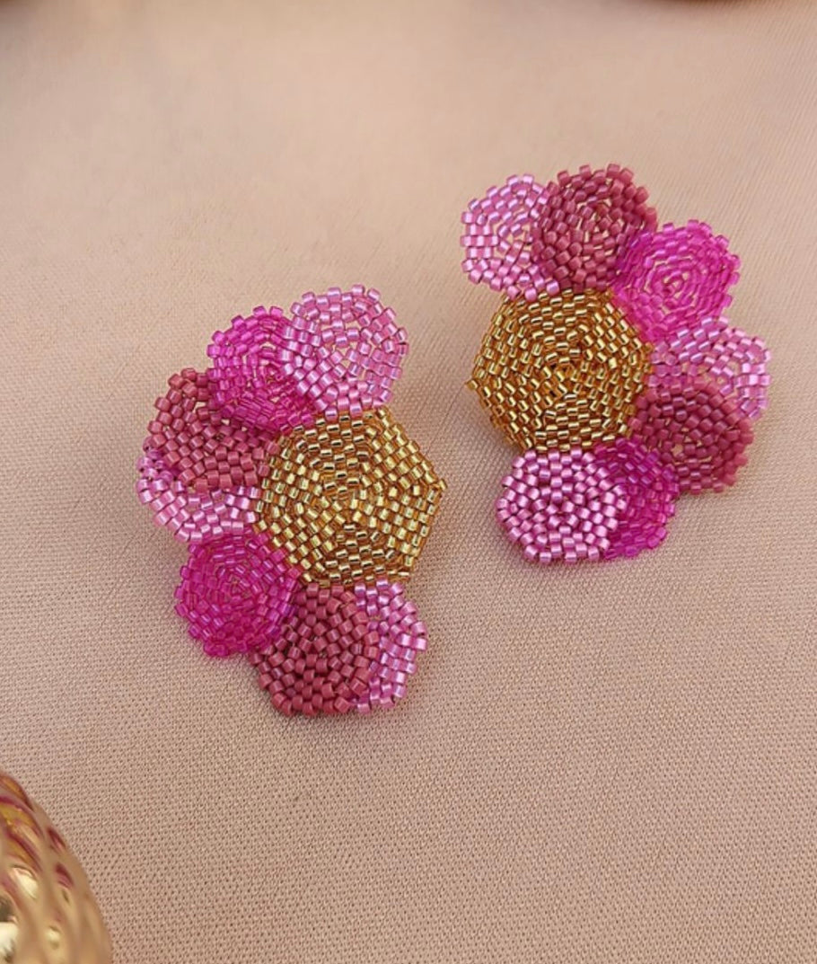Boucles d’oreilles faites à la main en perles de verre, tons rose, fuchsia et doré. Inspirées des fleurs estivales, légères et élégantes.
