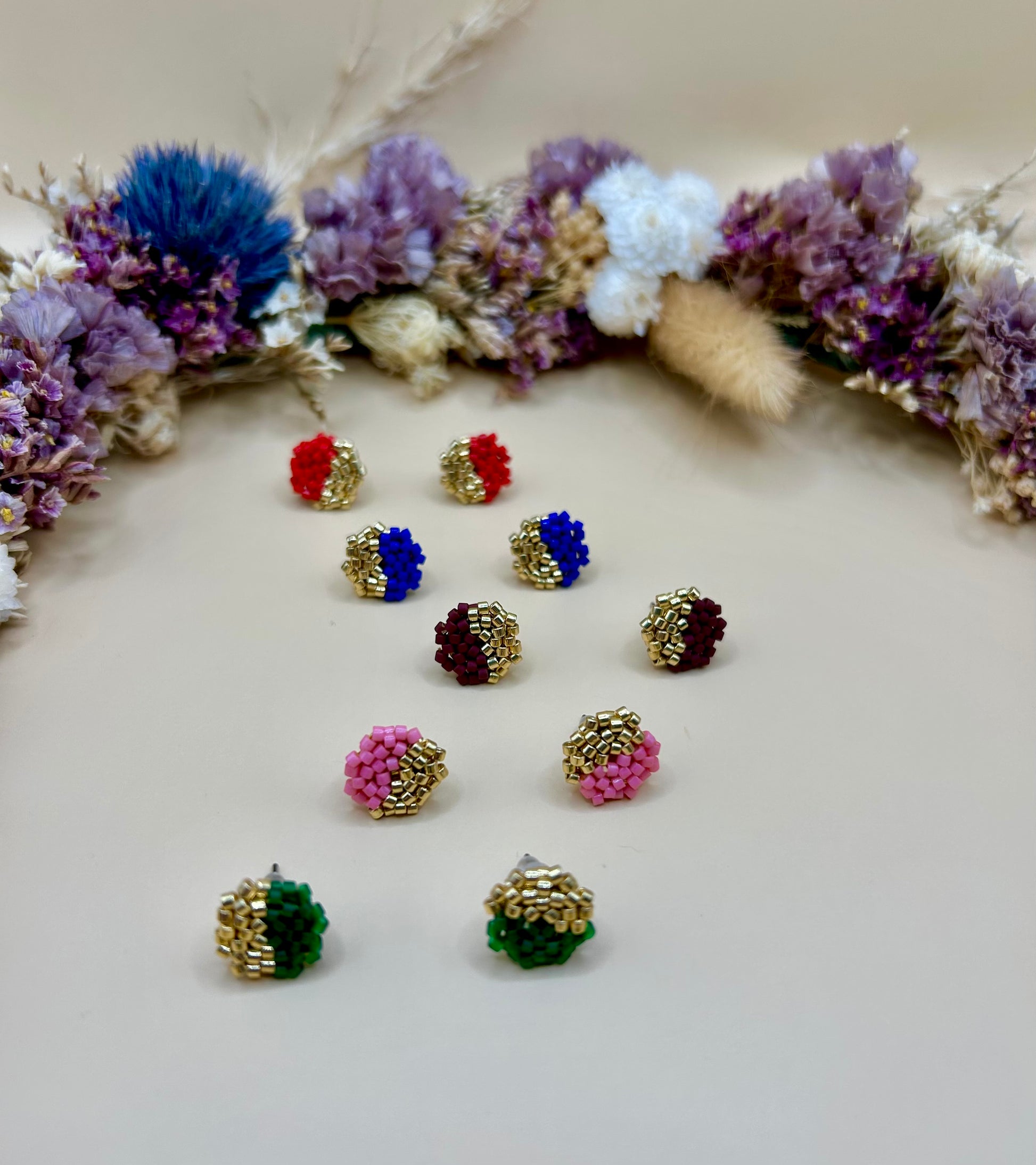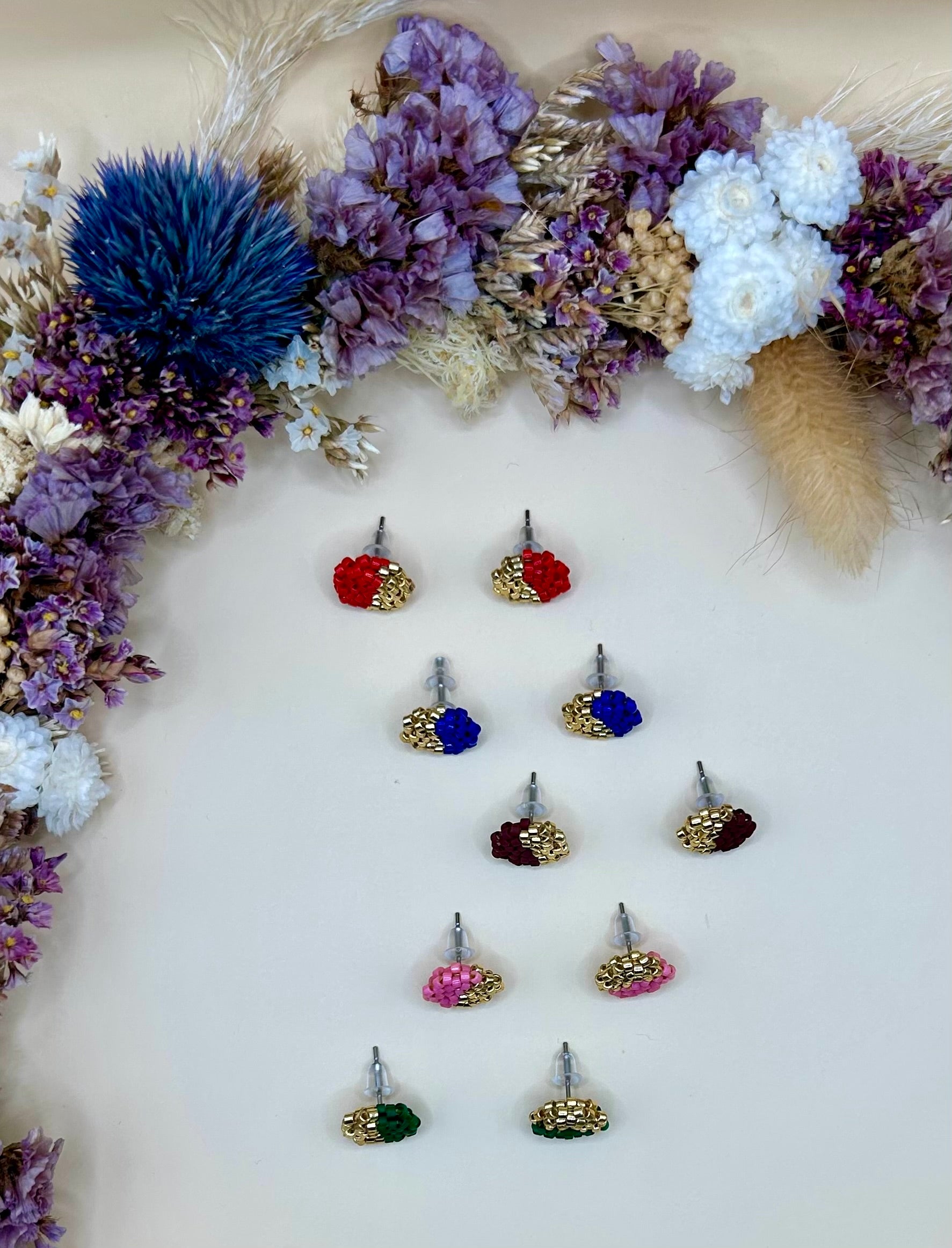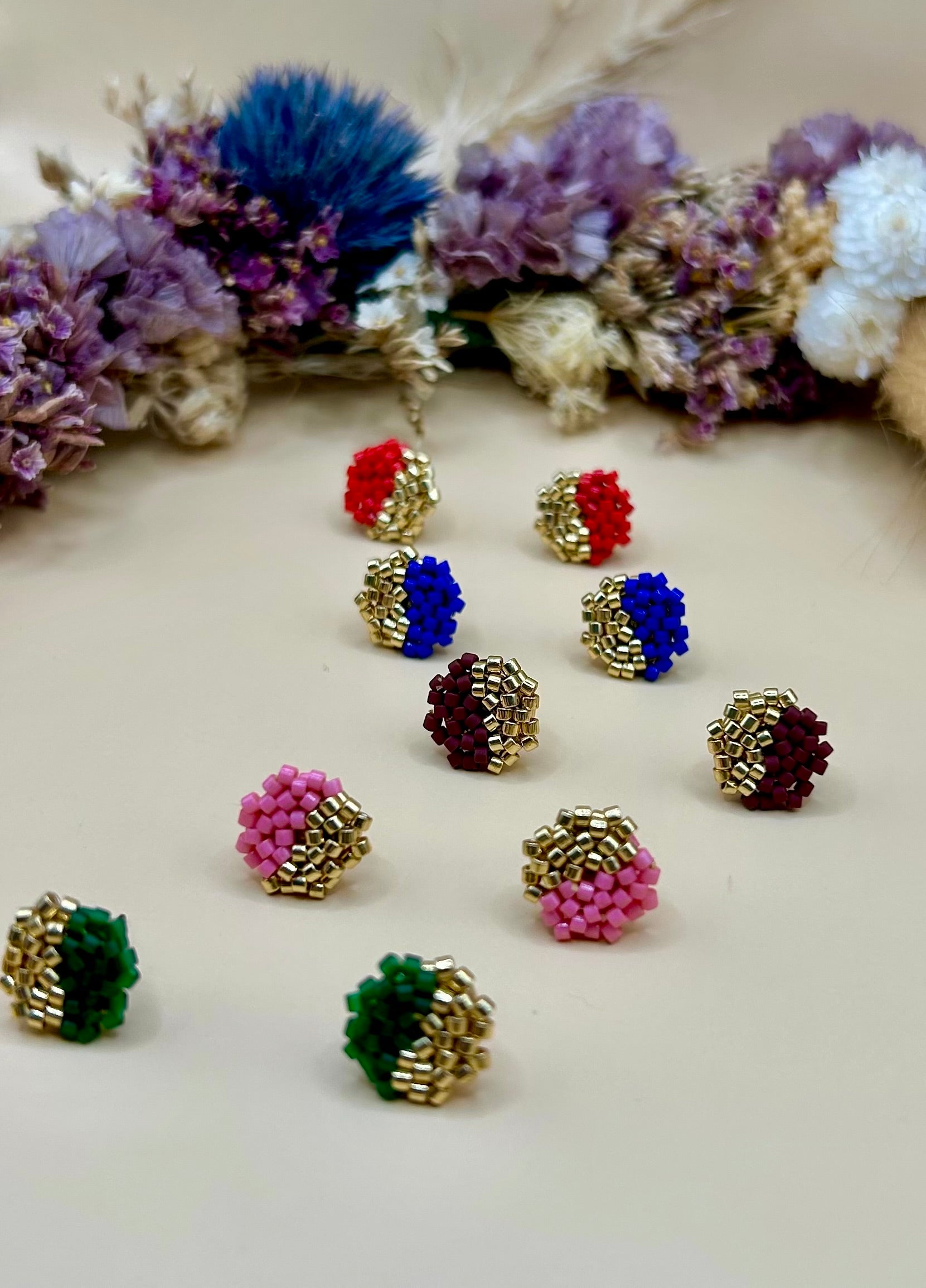 Les boucles “Marguerite” incarnent l’élégance intemporelle et le charme artisanal. Confectionnées à la main avec des perles Miyuki et des finitions dorées éclatantes, ces boucles uniques ajoutent une touche de caractère à votre style.