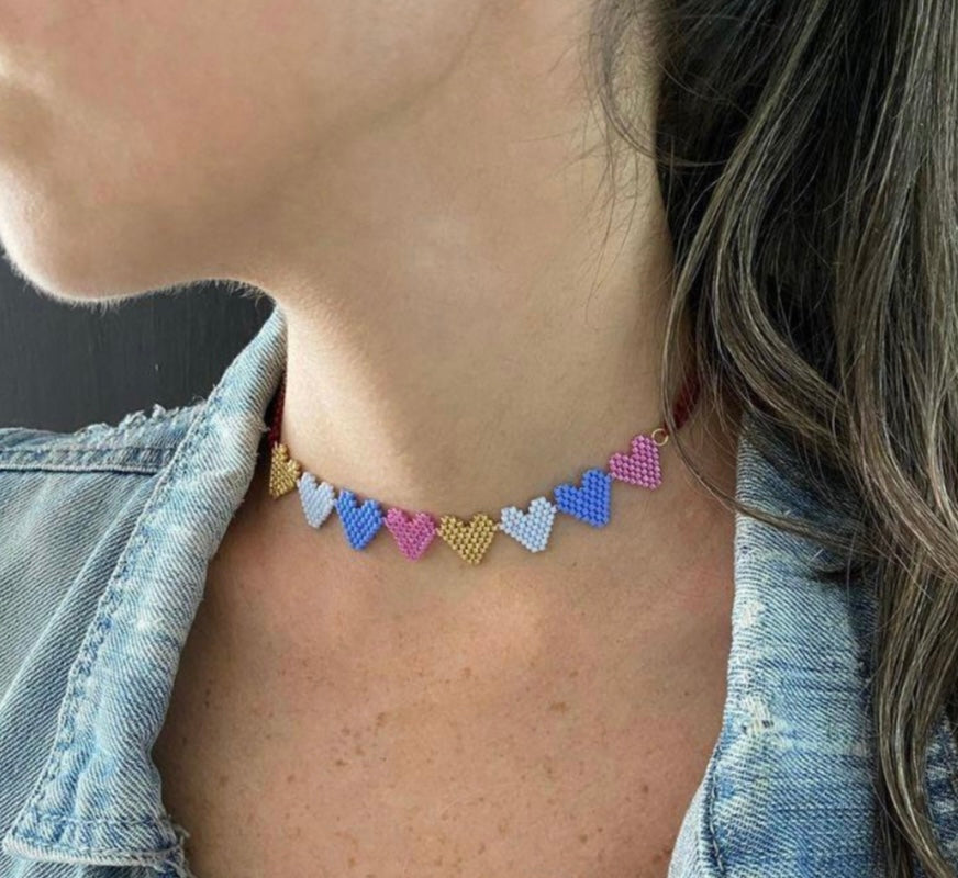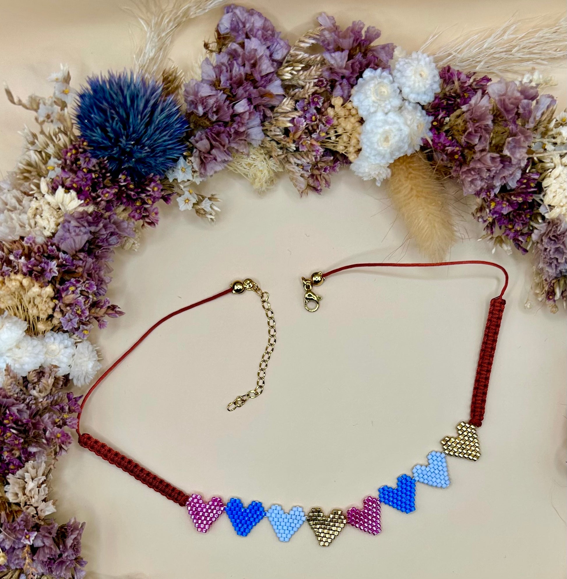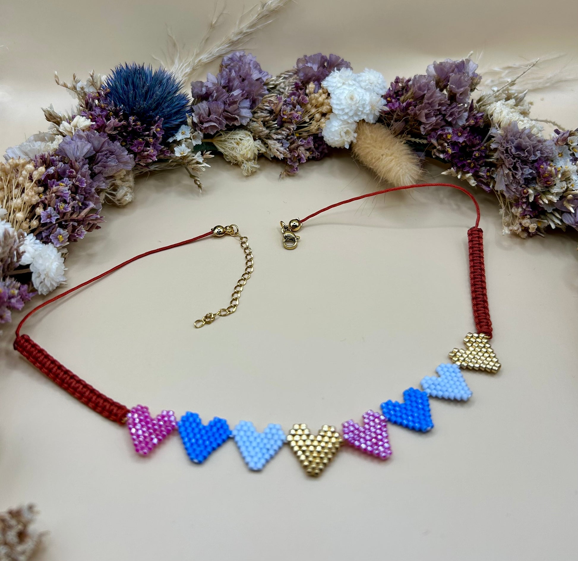 Ce collier ras du cou est une pièce unique entièrement confectionnée à la main avec des perles Miyuki, réputées pour leur qualité exceptionnelle. Ses petits cœurs colorés, aux teintes de rose, bleu, blanc et doré, apportent une touche d’élégance et de douceur.