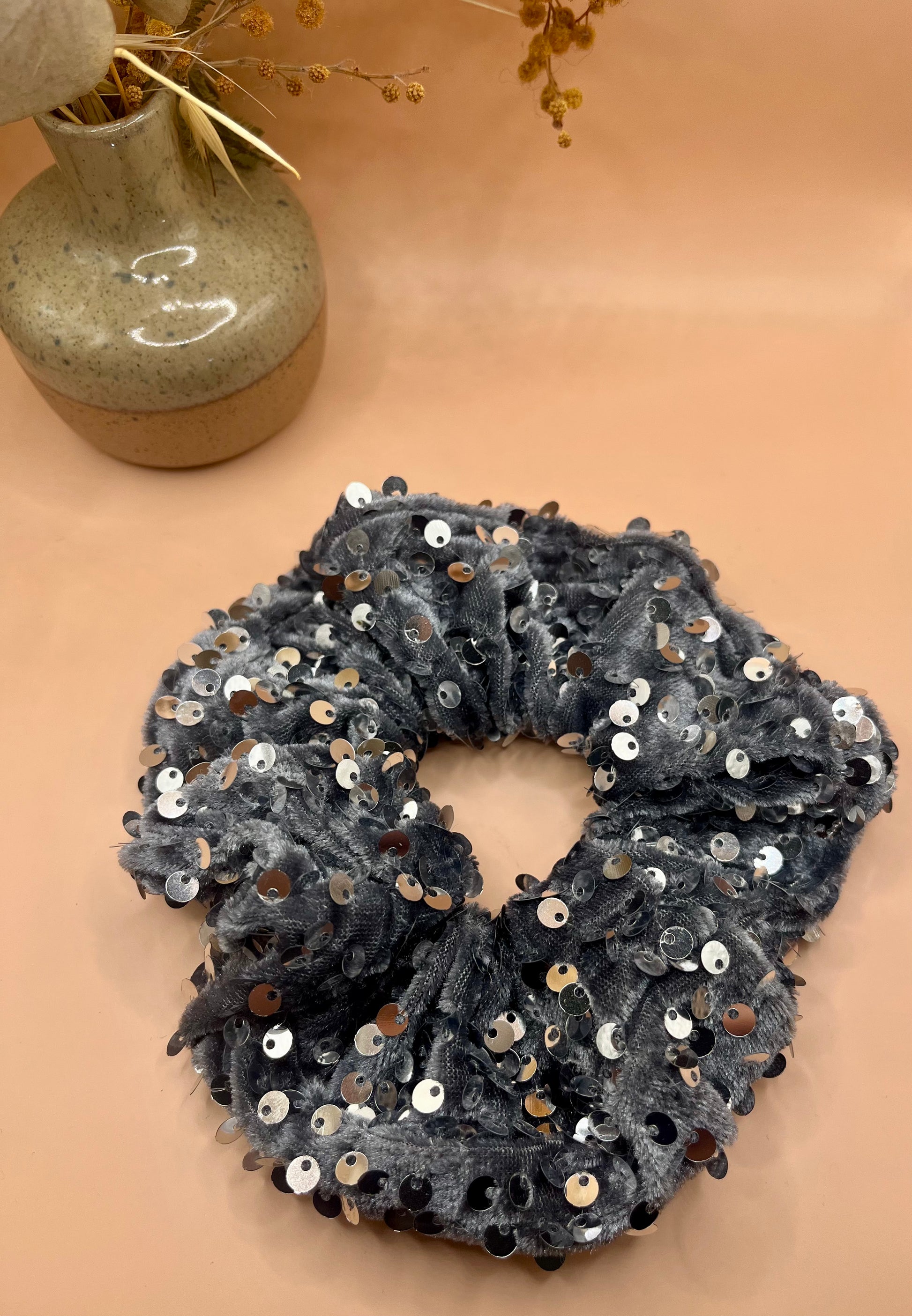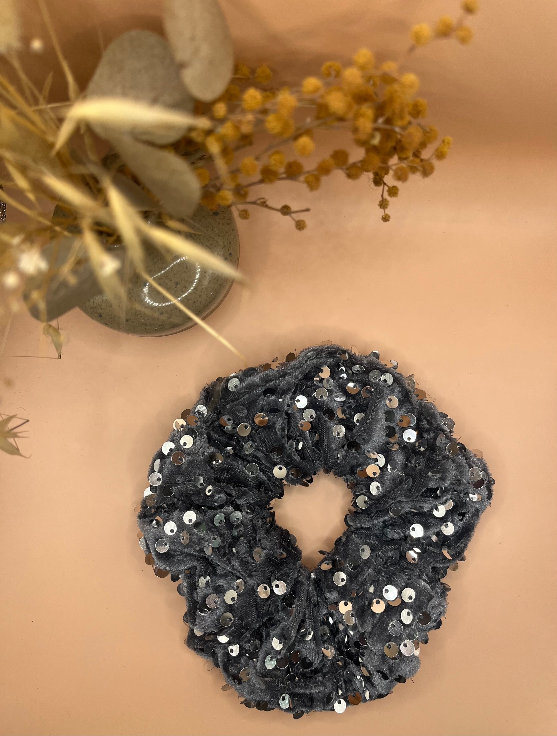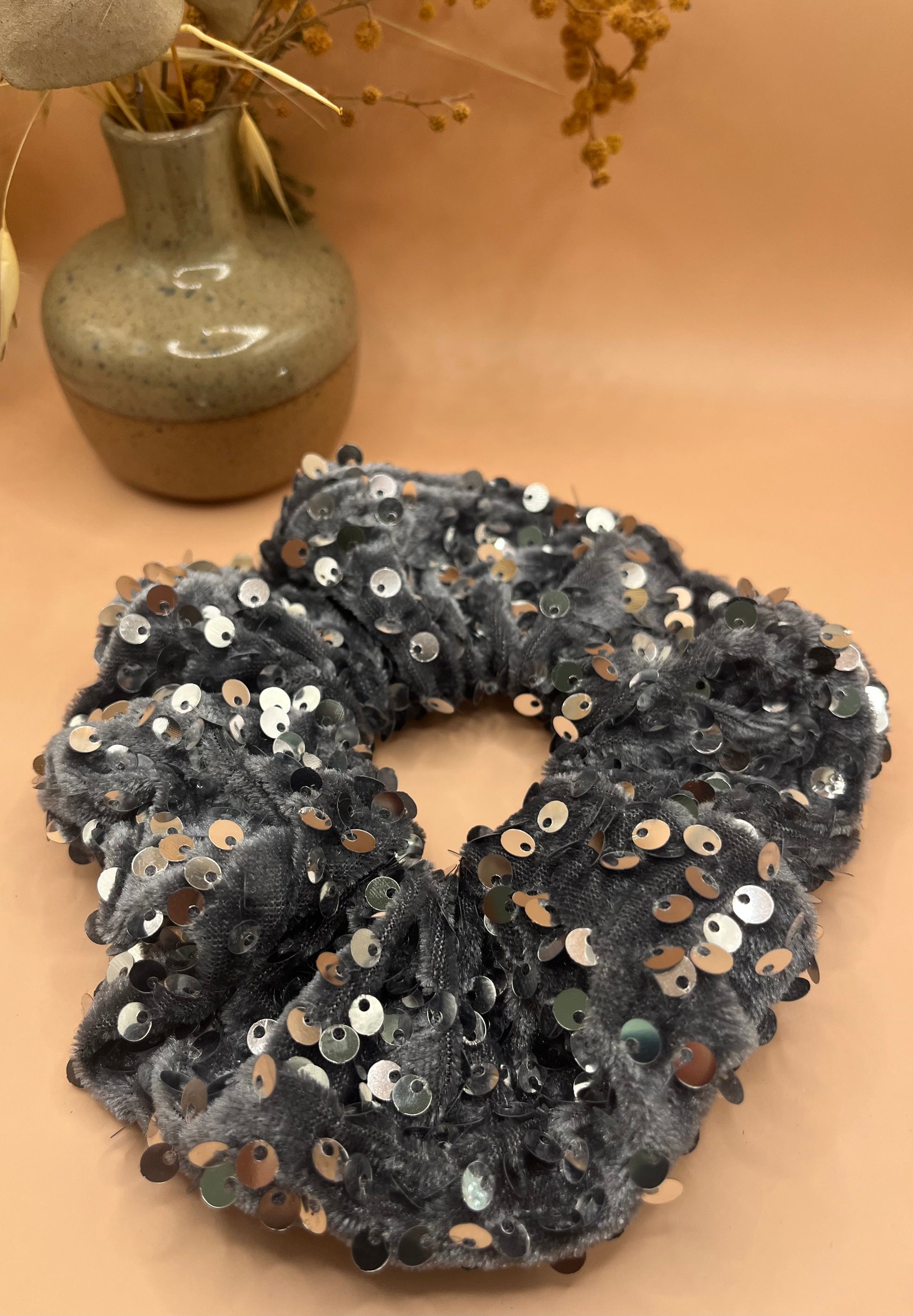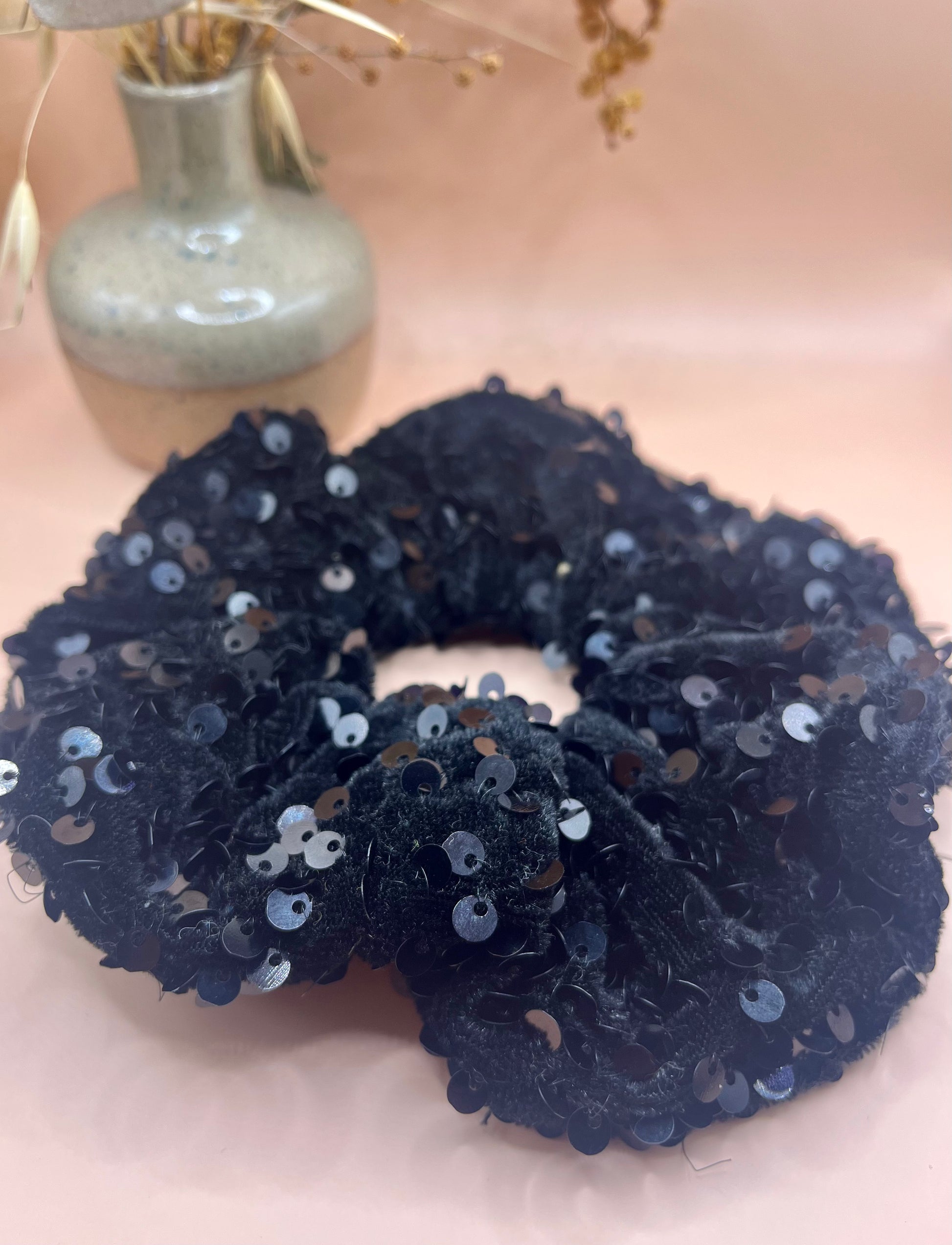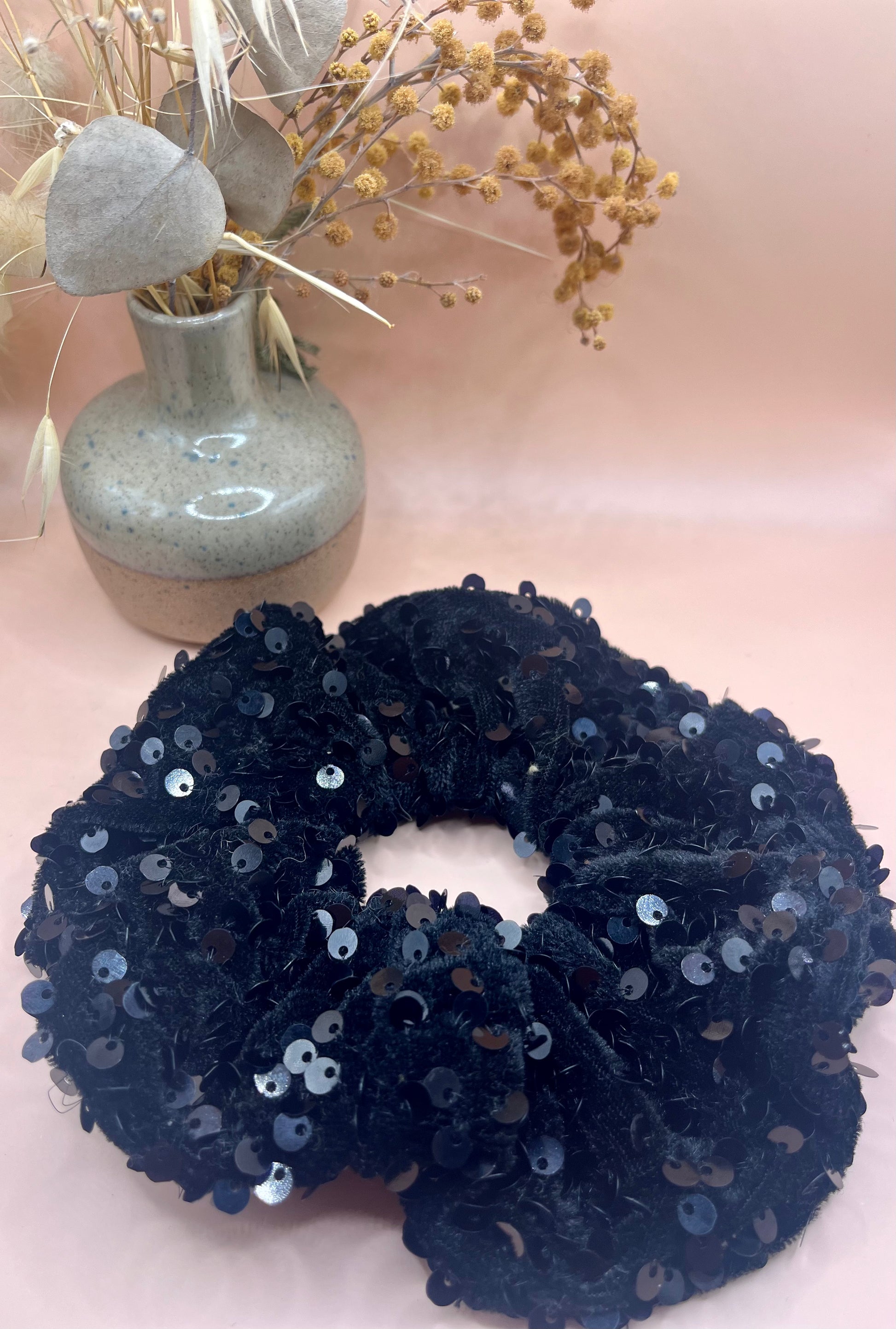 Sublimez vos coiffures avec ce chouchou en velours noir à sequins, parfait pour les fêtes. Chic et festif, il apporte une touche de peps tout en respectant vos cheveux, sans les accrocher