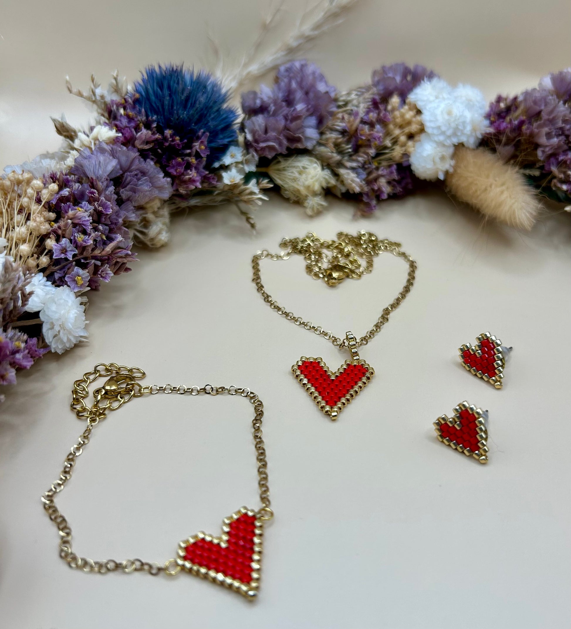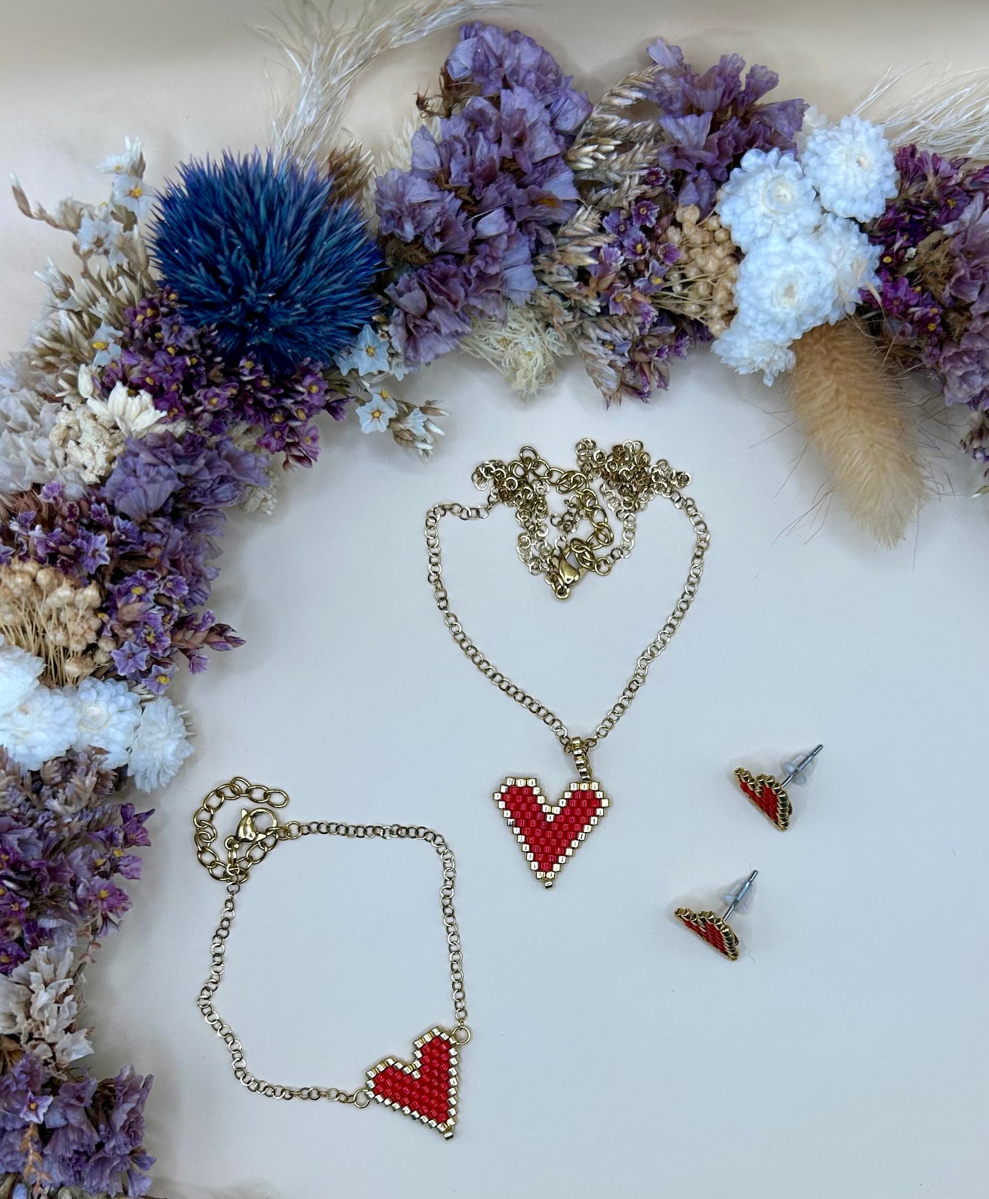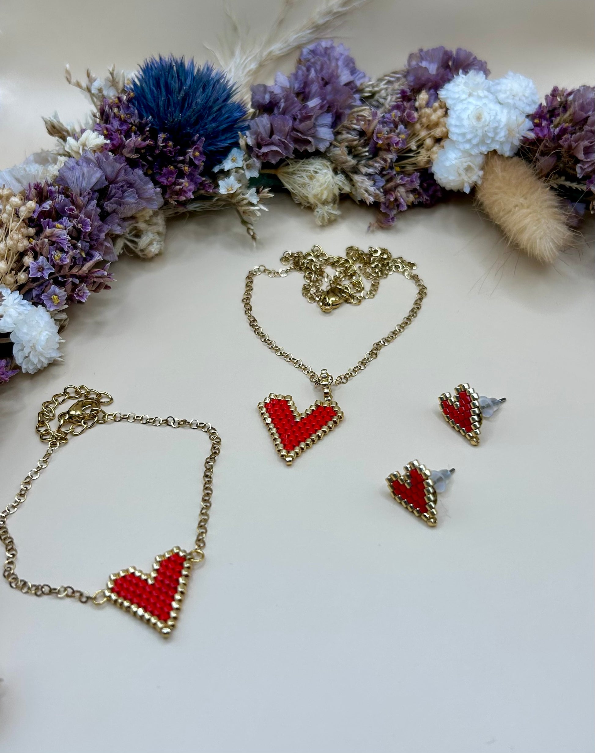 Laissez-vous séduire par cette parure élégante et intemporelle, composée d’un collier, d’un bracelet et d’une paire de boucles d’oreilles assortis. Chaque pièce est minutieusement confectionnée à la main avec des perles Miyuki de haute qualité, mettant en valeur un cœur rouge vif bordé de doré, symbole intemporel de passion et de raffinement.